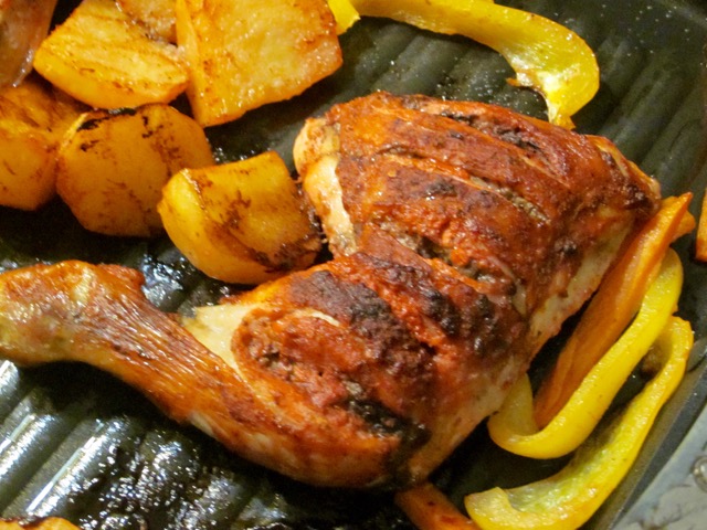 Add the potatoes to the double grill with chicken and continue cooking for a further 15 minutes. Flip the potatoes, baste the chicken and add the yellow or red bell pepper and cook for further 15 minutes.