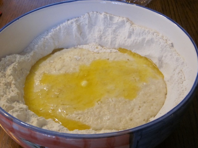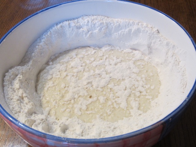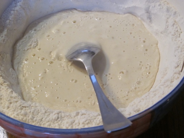 2. Pour the water into the well and mix in a little flour to make a runny batter. Sprinkle some flour on top of the batter then cover and leave in a warm place for 30 minutes or until batter starts tor rise and bubble on top.