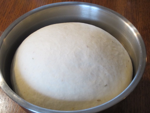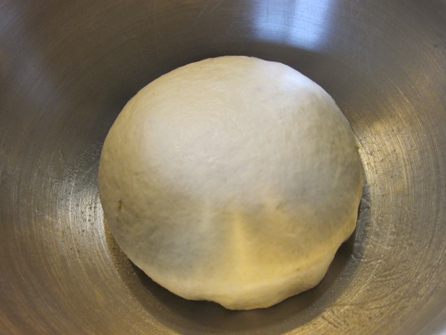 4. Turn onto a lightly floured surface and knead for 10 minutes, until smooth and elastic.  Place the dough in an oiled bowl, cover with oiled clingfilm, and leave to rise for one hour or until doubled in size.