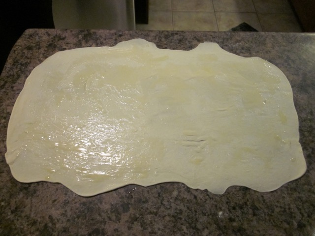 3. Take one rested dough, and roll out into a large thin transparent oblong (you can either use a rolling pin or stretch it out using your hands, whichever you find easy. (my oblong was about 18 x 12 inches). Sprinkle the melted butter all over the surface of the dough.
