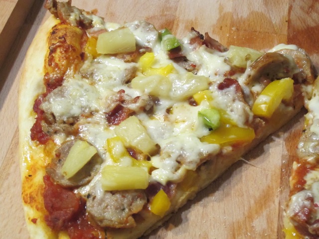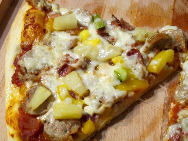 The pizza was so damn delicious. The sweetness of pineapple and saltiness of bacon and sausage and I gave it a kick of chilli. Thanks. Enjoy the rest of the week!