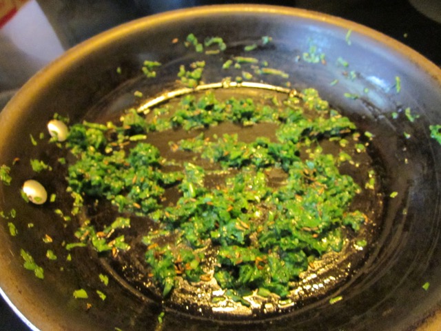 - To sauté spinach: heat oil in a pan, add cumin seeds, let them sizzle. Add the chopped spinach. Cook for 2 minutes, then add the cilantro, stir briefly then remove from heat and set aside to cool.