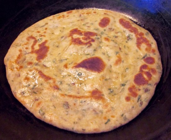 on both sides on medium high heat, until the golden brown spots appears. (make sure you oil both sides). Roll and cook the rest of the dough.
