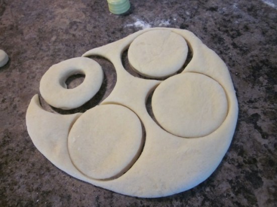 - Roll the rested dough into 5cm thick circle and cut into 3 inch rounds. Cut out centre with a 1 inch plain cutter. Put trimmings together and roll out and cut the dough, until fully used.