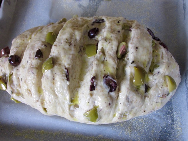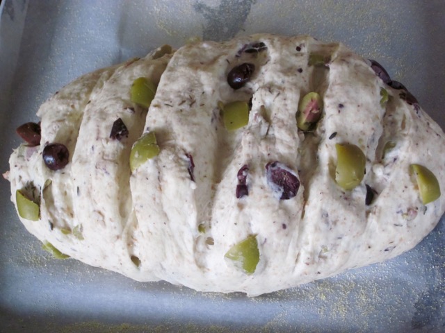 Olive Bread myfavouritepastime.com_7431then shape into an oval loaf, tucking the ends in place. Place on the prepared baking sheet. Using a very sharp knife, make deep slashes on the surface of the loaf. Cover the loaf with a lightly oiled cling film or polythene bag and leave in a warm place for 30-45 minutes or until doubled in size.