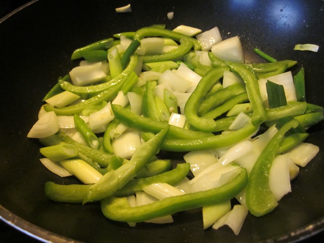 3. Heat cooking oil in a large wok or skillet, add bell pepper, onions and green onions and cook on hight heat for 2 minutes. Remove from pan and set aside.