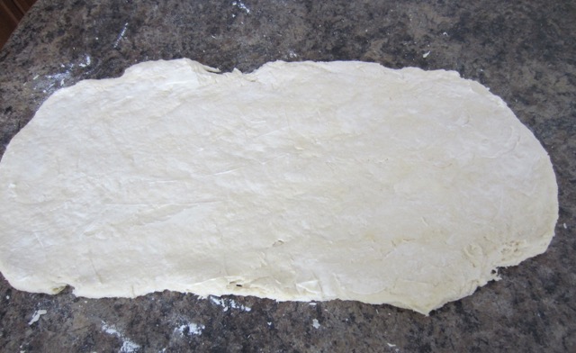 4. Pat the dough into a rectangle then roll out, lightly to a 18 x 10 inch (45 x 25 cm) rectangle (mine was quite crooked, just make sure you don’t over handle the dough).