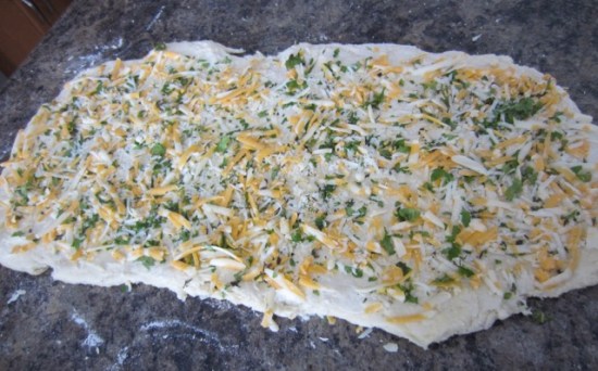 Cheese and Herb Rolls myfavouritepastime.comPat the dough into a rectangle then roll out, lightly to a 18 x 10 inch (45 x 25 cm) rectangle (mine was quite crooked, just make sure you don’t over handle the dough).