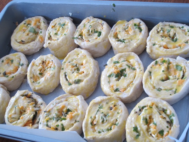 Cheese and Herb Rolls myfavouritepastime.comRoll up the dough tightly lengthways, and press the edges together firmly to seal. Cut the roll into 15 equal round pieces.
