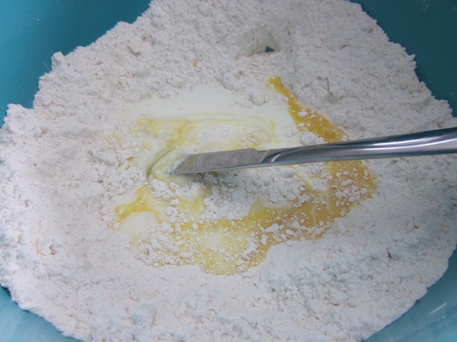 3. Add the eggs, and almost all the buttermilk and mix with a spoon or knife blade to a soft almost sticky dough, adding more buttermilk only if necessary.