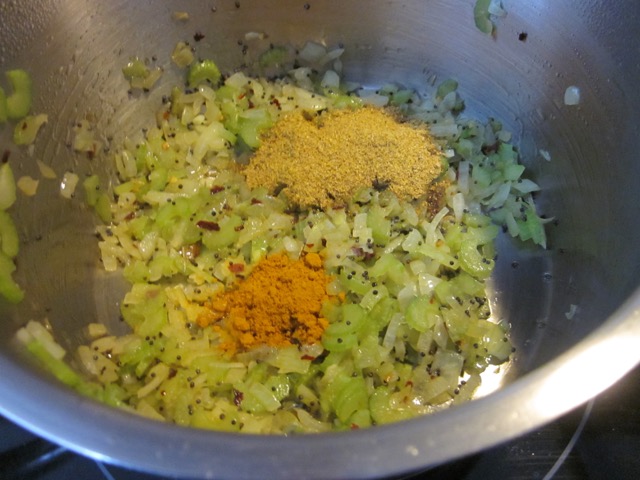 1. Heat the oil in a large pan. Add the mustard seeds. Cover and cook until they begin to pop. Add the onion, celery and chilli and cook for 5-7 minutes, until soft.