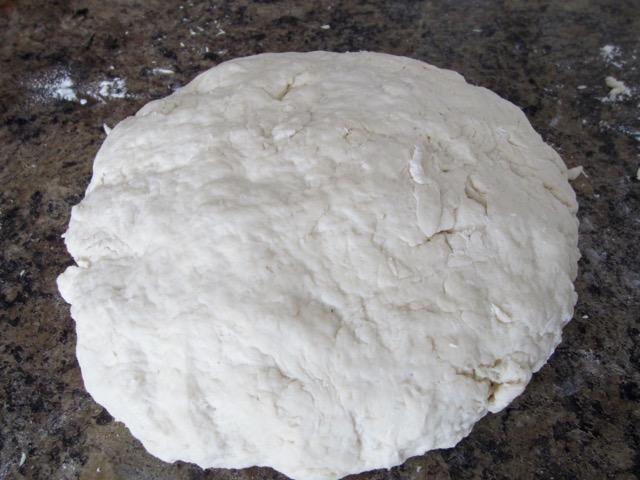 - Add the butter, milk and ½ cup water into the well and mix briefly and lightly into a soft and slightly sticky dough, adding the remaining water only if necessary. Turn the dough onto a lightly floured surface, knead briefly for 30 seconds and form into a 7 ½-inch round bread (don’t over handle the dough). Mark the bread into 6 wedges using the blunt side of a table knife.