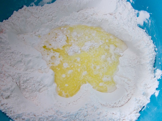 Sift or whisk the flour, baking powder, salt and sugar, into a bowl. Make a well into the centre. Add the butter, milk and ½ cup water into the well and mix briefly and lightly into a soft and slightly sticky dough, adding the remaining water only if necessary.