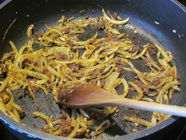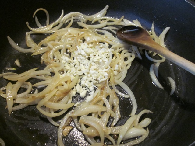 1. Heat oil in a pan or skillet over medium high heat and add onion. Cook stirring until onion is golden. Reduce heat, add garlic and cook 1 minute.
