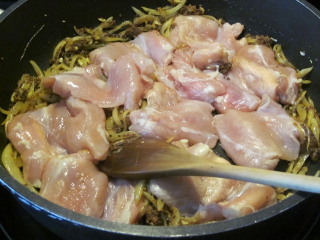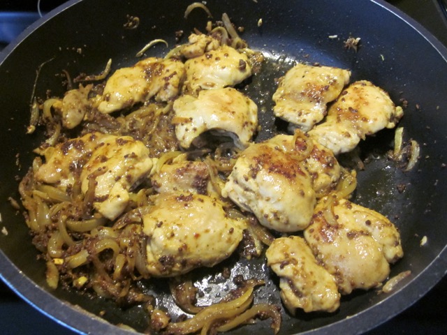 Spicy Mustard Chicken myfavouritepastime.comHeat oil in a pan or skillet over medium high heat and add onion. Cook stirring until onion is golden.