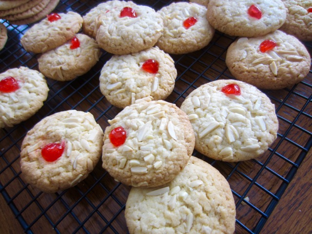 • Place in the fridge for about 30 minutes to set, then using a ½ tablespoon, make 25-30 balls. Roll onto slivered almonds. Place cherry on top arrange onto prepared sheets, spaced apart. Bake 15 minutes until golden. Transfer onto cooling rack.