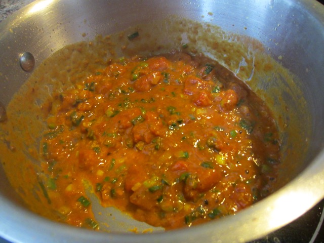 Melt butter or add olive oil to a pan or skillet over medium heat. Reduce the heat and add the curry paste. Cook stirring, for 3 minutes over low heat.