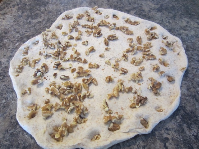Turn the dough on a lightly floured surface and gently knock back. Stretch out or pat the dough into a circle and sprinkle the nuts into the circle. Gently press the nuts into the dough, working them in gently,