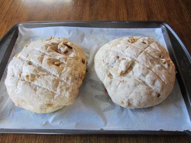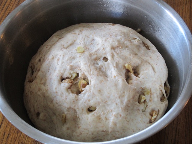 - Turn the dough on a lightly floured surface and gently knock back. Stretch out or pat the dough into a circle and sprinkle the nuts into the circle. Gently press the nuts into the dough, working them in gently, then form into a ball and let it rest in the oiled bowl for 30 minutes.
