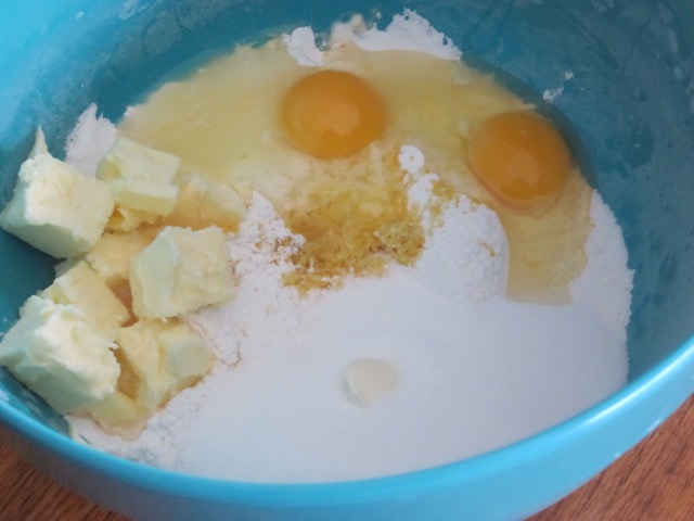 Add the sugar, eggs, butter, lemon zest and lemon juice to the sifted flour and,