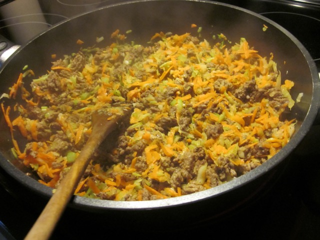 Heat olive oil over high heat and add the ground beef and cook for about 5 minutes until nicely browned.