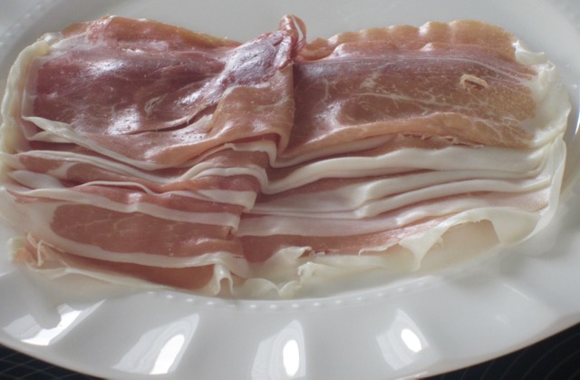 Prosciutto is cut into tissue-thin slices and is usually served with figs or melon, or added to cooked dishes at the last minute. It is also eaten as accompaniment to cooked spring vegetables, such as asparagus or peas.