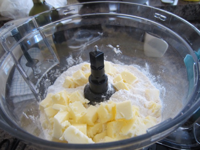 Transfer a half of the flour mixture to a food processor. Add the butter and pulse several times to combine. Do not over-process; some butter pieces should remain the size of large peas, while others pieces will be smaller.