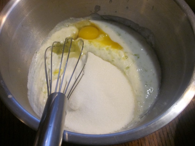 In another bowl, whisk together sugar, eggs, yoghurt, melted butter and lemon zest (rind)
