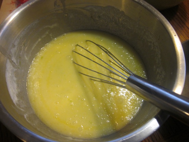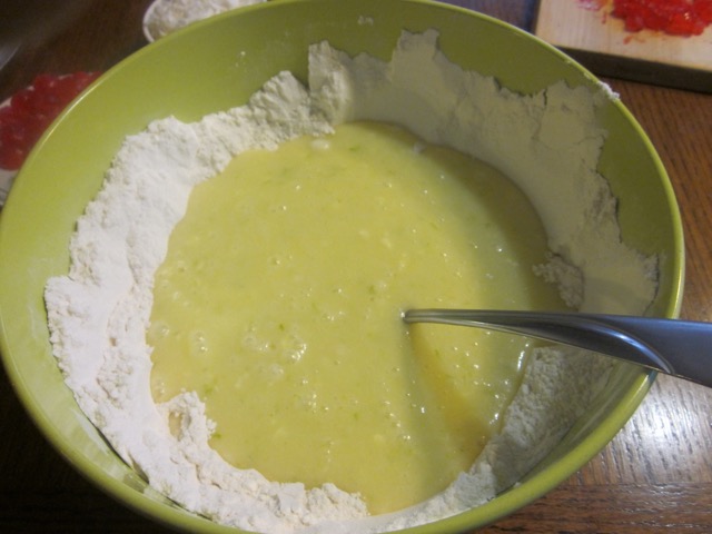 Add the whisked mixture to the sifted flour. Stir gently until just combined.Do not over mix.