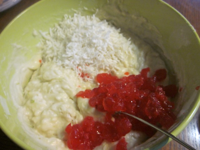 - In another bowl, whisk together sugar, eggs, yoghurt, melted butter and lemon zest (rind) until well blended. Add the whisked mixture to the sifted flour. Stir gently until just combined. Do not over mix. Fold in cherries and coconut.