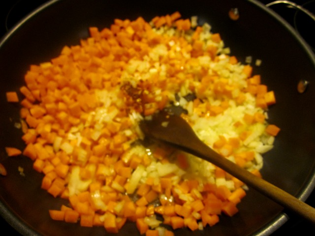 Heat 1-2 tablespoons olive oil in a large pan or skillet and add the onions, carrots and chilli flakes..Cook over medium heat for 5-7 minutes. Season with salt.