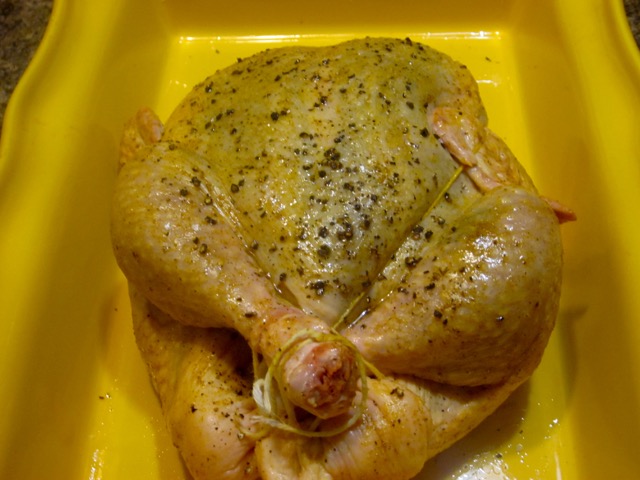 2. Sprinkle the inside of the chicken liberally with salt and freshly ground pepper. Carefully lift the skin and rub half of the ground spices evenly under the skin. Close the cavity with a toothpick or small skewer. Truss the chicken.