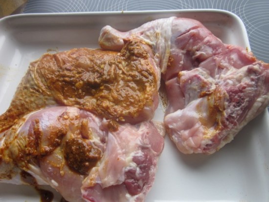 2. Cut deep slits on each chicken piece and rub the spice evenly over each chicken, on both sides.