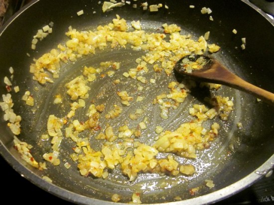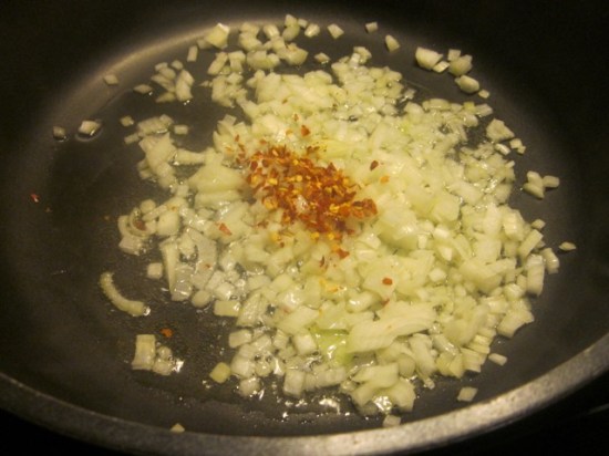 Heat the olive oil in a large pan (skillet) over medium high heat and add the onions and chilli. Sauté the onions until translucent.