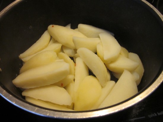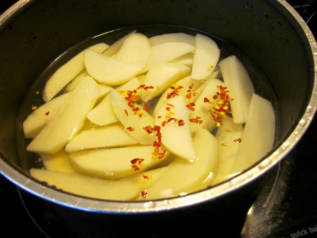 - Parboil potatoes for 4-6 minutes in boiling salted water. Add some pepper or chilli to the water.
