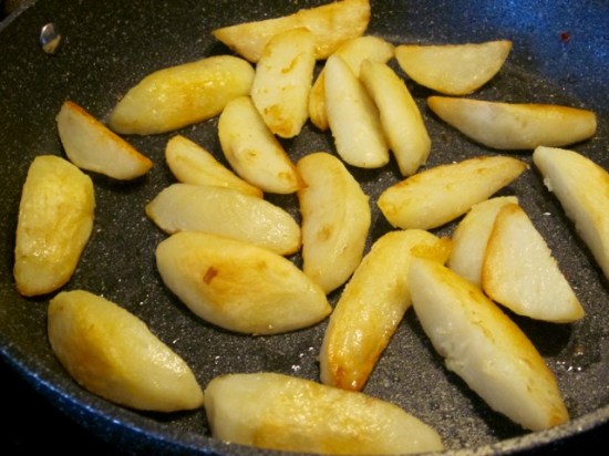 - Heat the oil in a large heavy based skillet or pan, add the potatoes, season with salt. Sauté on all sides until golden and crisp.