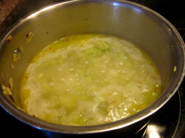 Heat the olive oil in a pan, add the onions, potato and cucumbers and sauté for 5-7 minutes until soft,