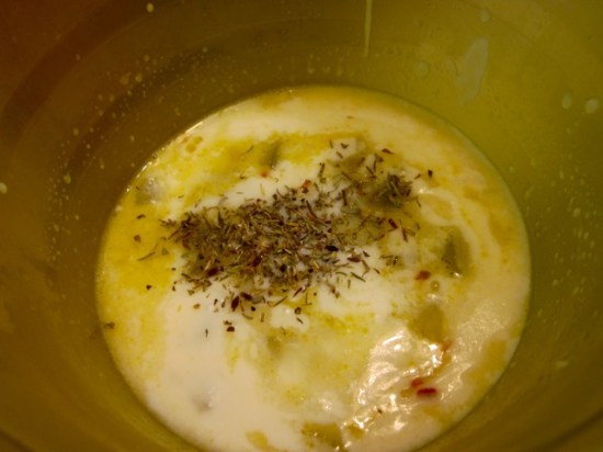 3. Mix the white sauce with the cooked cucumber and potato. Add the thyme and  blend until smooth.