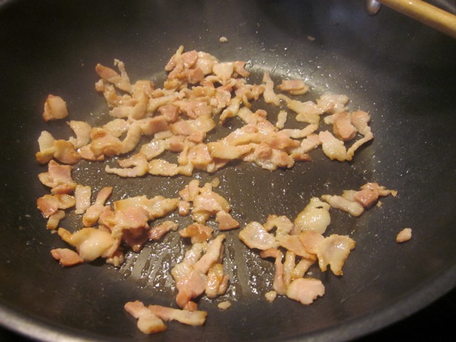 In a large frying pan, cook the bacon until browned.
