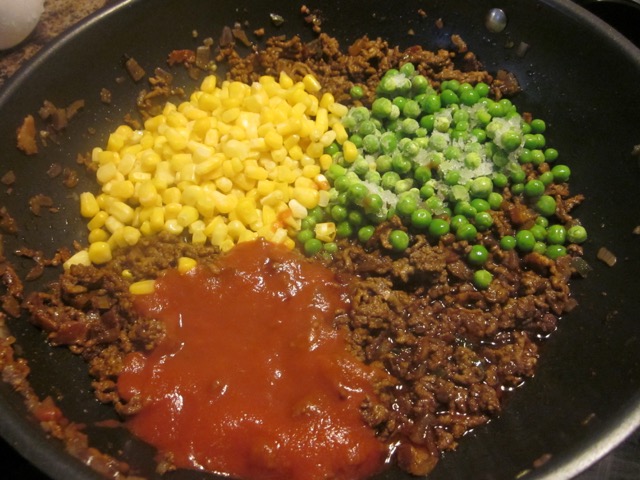 Stir in the crushed tomato, corn, green peas and red wine and cook a further 5 minutes.