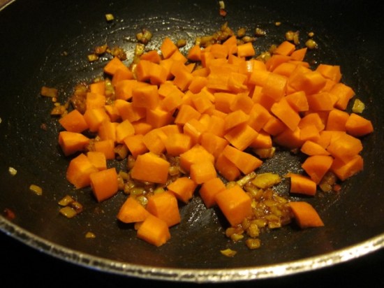 Heat the olive oil in a large pan (skillet) over medium high heat and add the onions and chilli. Sauté the onions until translucent.