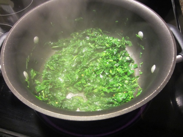 For Fresh Spinach: in a small pot heat 2 teaspoons olive oil over medium-low heat and add the garlic and sauté 1 minute. Add the chopped spinach, increase heat and cook until all liquid is absorbed. Remove and set aside to cool.