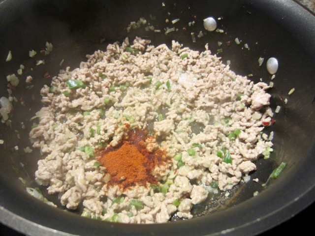 1. Ground Pork: in a large skillet, heat 1 tablespoon olive oil over medium-high heat and sauté the onion and capsicum until fragrant and soft. Add garlic and cook one minute. Add the ground pork, and cook until no longer pink and slightly browned, about 10 to 12 minutes, breaking up the meat with the back of a wooden spoon. Add the paprika and chilli flakes and cook 1 minute.  Drain any excess fat and set aside to cool.