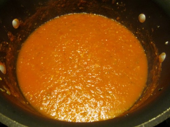3. To make Tomato Sauce: in a large saucepan, heat the olive oil over medium heat. Add the onion, and garlic and cook until soft but not brown. Add the dried oregano or thyme and cook for another 1 minute. Add the coarsely pureed tomatoes and bring to the boil, stirring often.  Season with salt and freshly ground pepper. Lower the heat and simmer 10 minutes.