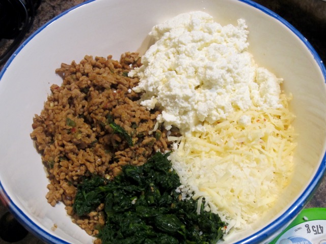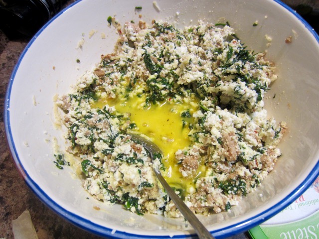 4. To Make Ricotta filling: in a large mixing bowl stir together the dried or cooked, cooled spinach, ground pork filling, ricotta, 1½ cups Pecorino Romano, salt, and freshly ground black pepper, to taste. Add the egg and mix until combined.