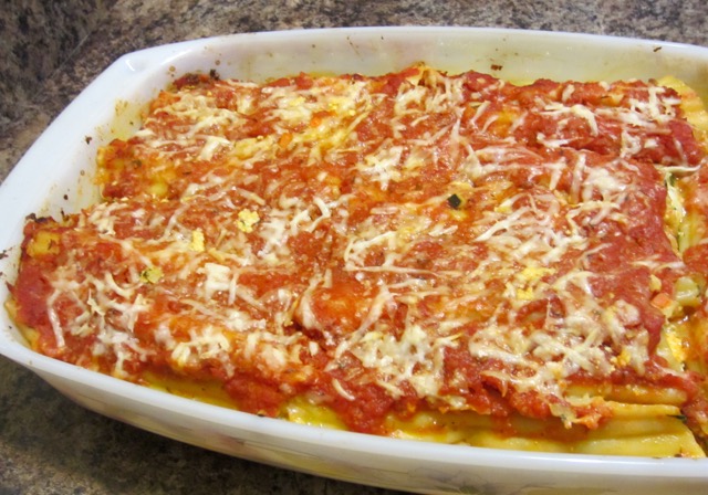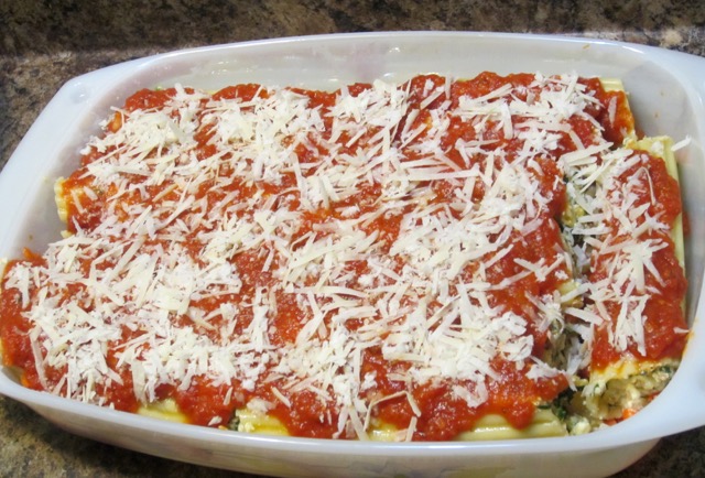 Spoon the remaining 2 cups tomato sauce evenly over the cannelloni/manicotti.