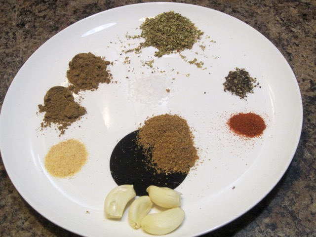 Combine the garlic, coriander, cumin, oregano, onion powder, salt, black pepper, and cayenne pepper in a small bowl