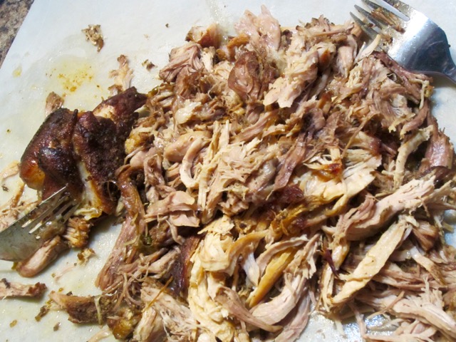 Remove the meat from the pot and set aside to cool. Pour the cooking juices to a separate container and scheme off the fat and set aside. Shred the meat, using two forks
