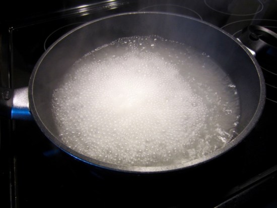 Bring the 5-cups water to a rolling boil and add the baking soda to the water.