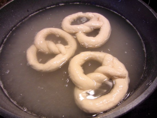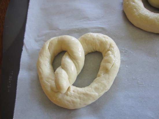 5. Knock back the dough once and divide into 12 equal pieces. Roll each piece into a rope 24-30 inch long and twist into a pretzel shape. (keep the dough and rolled pretzels covered with a kitchen towel at all times)